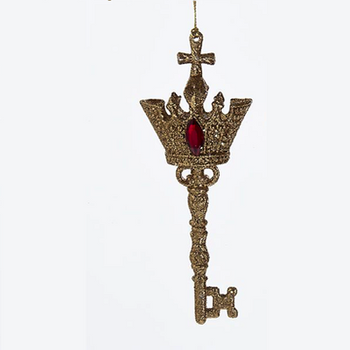 KURT ADLER 6" GOLD GLITTERED ACRYLIC KEY & CROWN w/RED JEWEL CHRISTMAS ORNAMENT