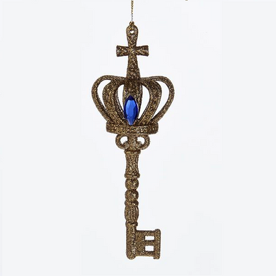 KURT ADLER 6" GOLD GLITTERED ACRYLIC KEY & CROWN w/BLUE JEWEL CHRISTMAS ORNAMENT