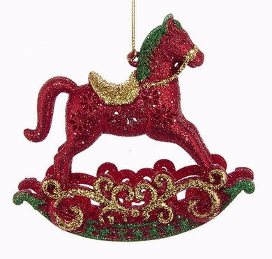 KURT ADLER 4.5" ACRYLIC RED/GREEN/GOLD GLITTER TOY ROCKING HORSE XMAS ORNAMENT