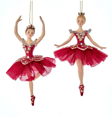 KURT ADLER SET OF 2 REGAL RED BALLERINAS w/CLEAR GEMSTONES XMAS ORNAMENTS E0735