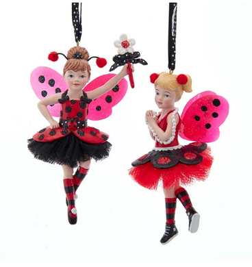 KURT ADLER SET OF 2 LADYBUG GIRL FAIRY BALLERINA w/TUTU & WINGS XMAS ORNAMENTS