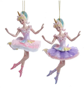 KURT ADLER SET OF 2 MULTI-COLOR PASTEL UNICORN BALLERINA CHRISTMAS ORNAMENTS