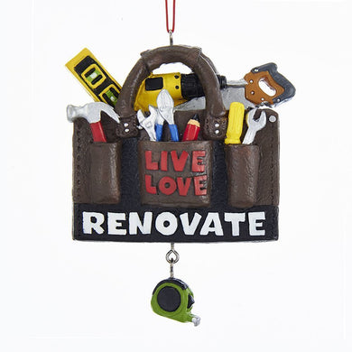 KSA 3.75" HAND PAINTED "LIVE LOVE RENOVATE" TOOL BAG DANGLE CHRISTMAS ORNAMENT