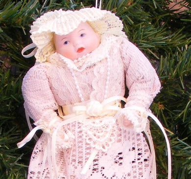KSA PORCELAIN VICTORIAN BABY IN ECRU LACE XMAS ORNAMENT