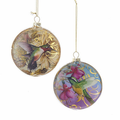 KSA SET OF 2 ROUND GLASS DISCS w/GOLD/PASTEL HUMMINGBIRD PATTERN XMAS ORNAMENTS