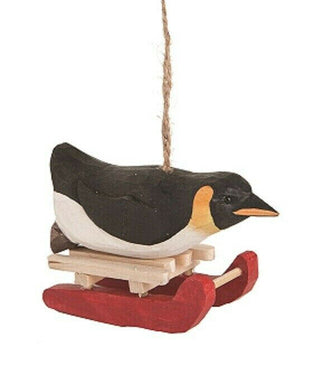 GALLERIE II 4" HAND CARVED WOODEN PENGUIN SLED RACER CHRISTMAS ORNAMENT