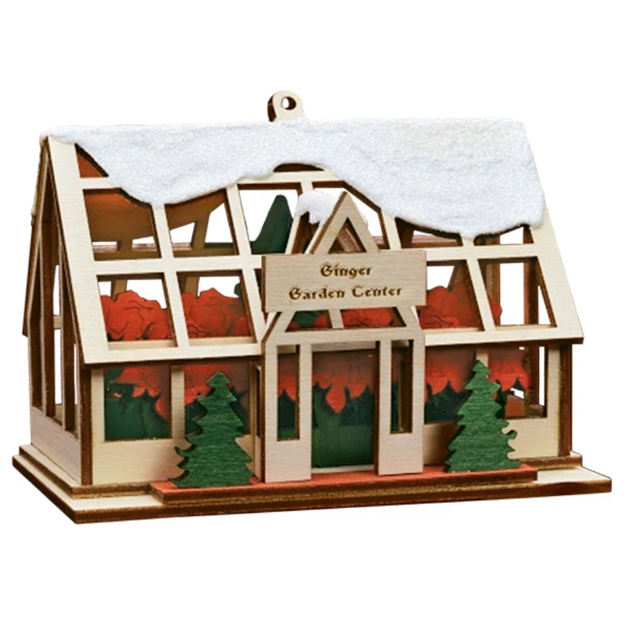 Ginger Garden Center has a small hole on its underside designed to borrow a standard bulb from your Christmas tree to light up the cottage. Upon lighting your cottage, you will immediately discover the first of many secrets, the beautifully crafted scene inside. The gingerbread men hid all the supplies; can you find the spade, watering can and garden gloves?