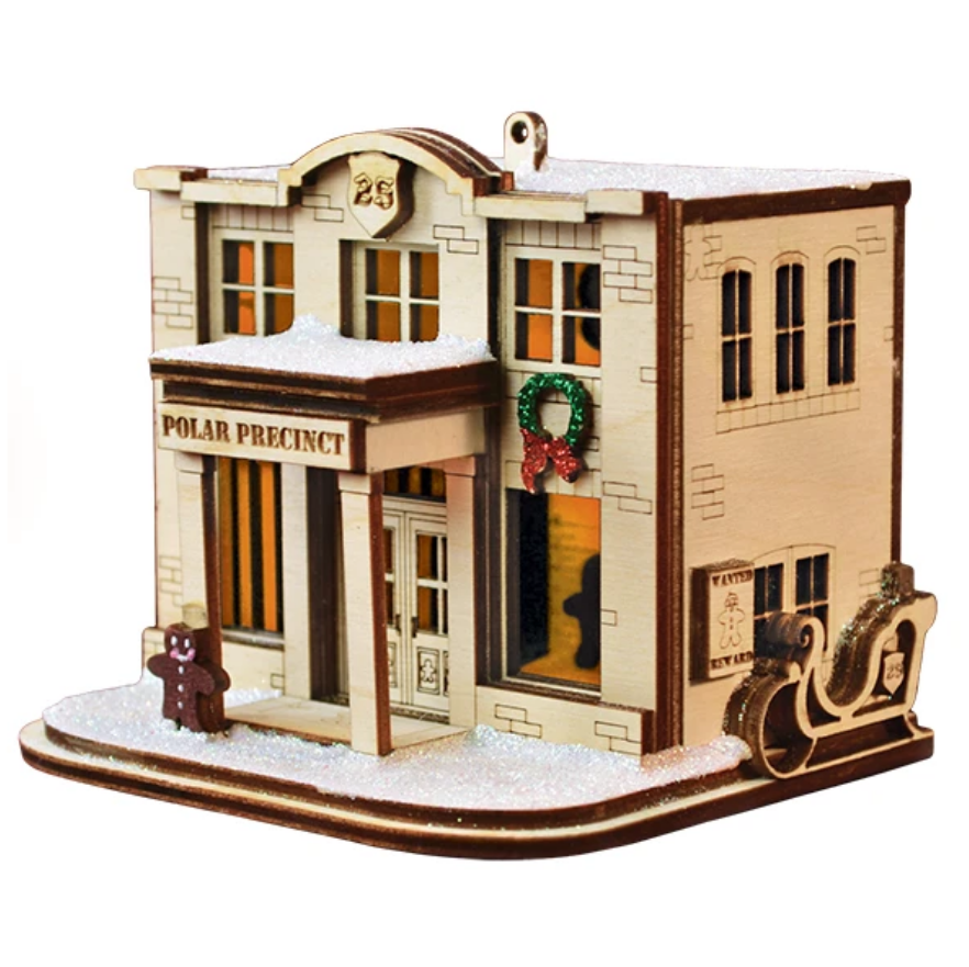 Polar Precinct #25 has a small hole on its underside designed to borrow a standard bulb from your Christmas tree to light up the cottage. Upon lighting your cottage, you will immediately discover the first of many secrets, the beautifully crafted scene inside. This iconic police station is modeled after a 1950 s TV show holds many secrets; can you find the donuts and fishing pole?